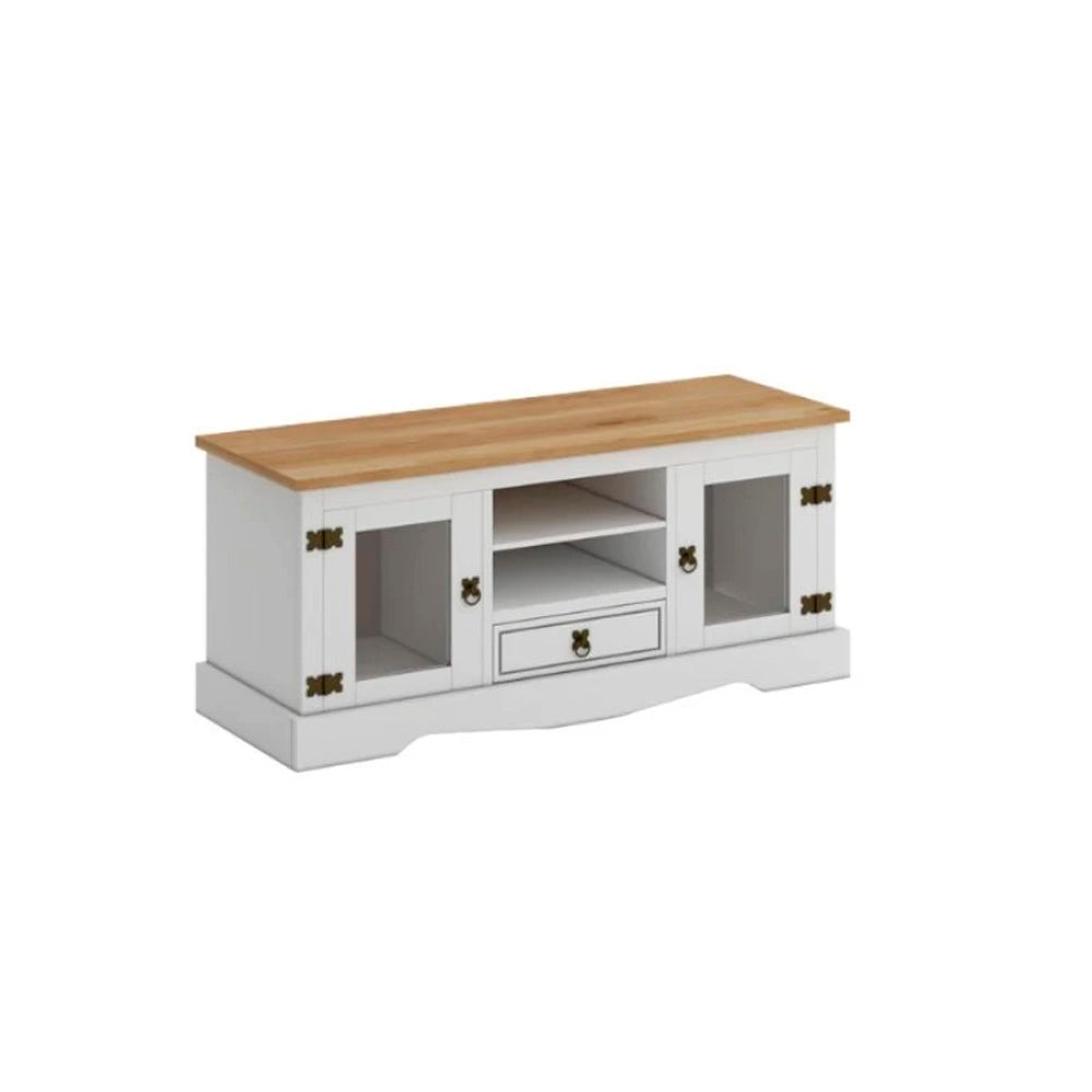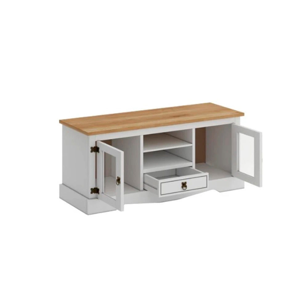 - Rack en madera maciza, 2 puertas de vidrio y 1 estante y 1 cajon.