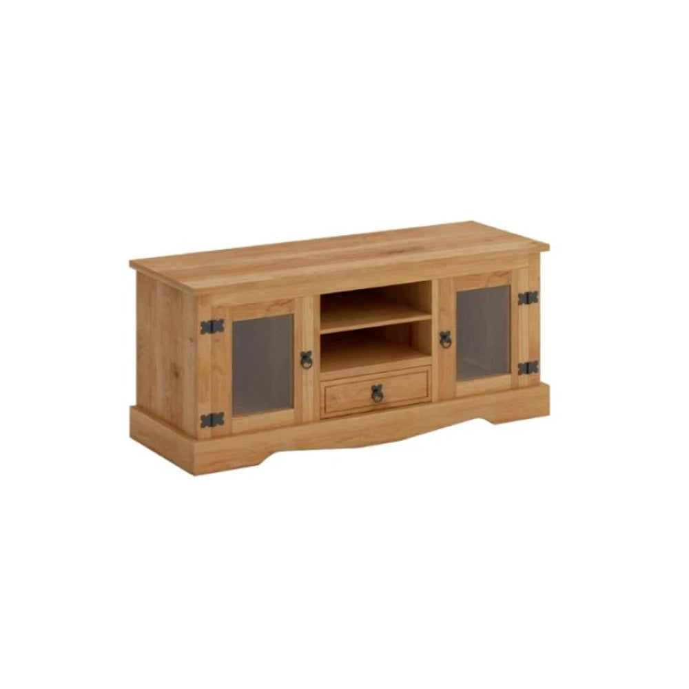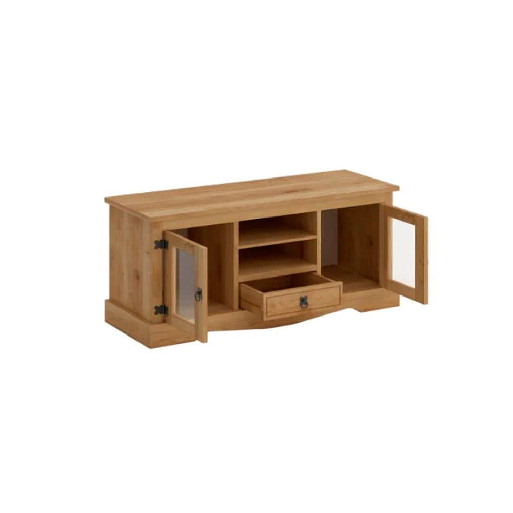 - Rack en madera maciza, 2 puertas de vidrio y 1 estante y 1 cajon.